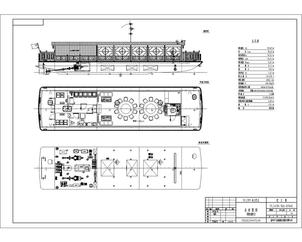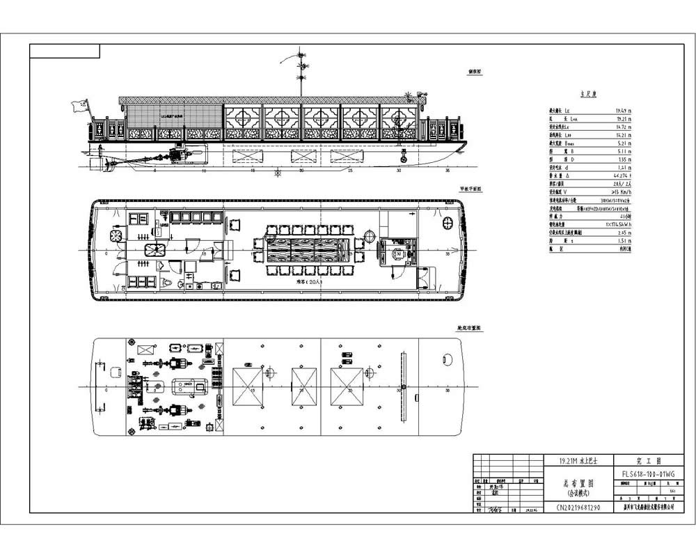本船為鋼鋁結構、單甲板、單底、單舷、尾機型、雙電機、雙槳、雙舵、混動電力推進的船舶,航行于浙江嘉興內河水域,是集水上交通客運、商務接待等為一體的綜合性客船,本船具備夜航功能。